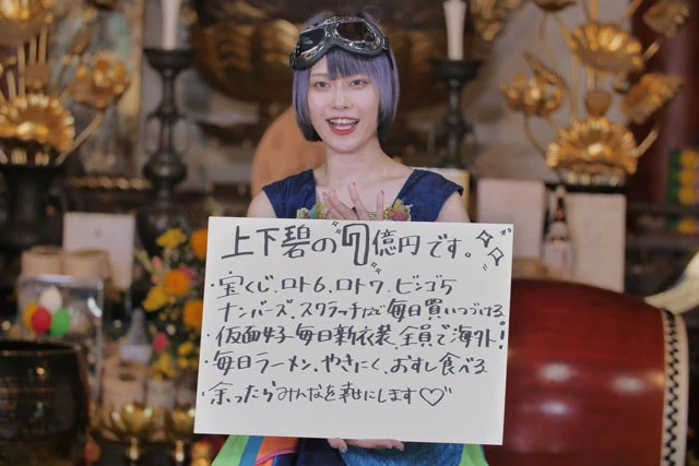 イベントに登壇した野咲と上下は、7億円当選した際の使い道を発表。野咲は東京と地元・大阪での住宅や車の購入、さらに新幹線のグリーン車代など具体的な希望がずらり。上下は「運を使い果たしてない」ことを証明するため、毎日宝くじを購入することや仮面女子の新衣装購入などが並んだ。