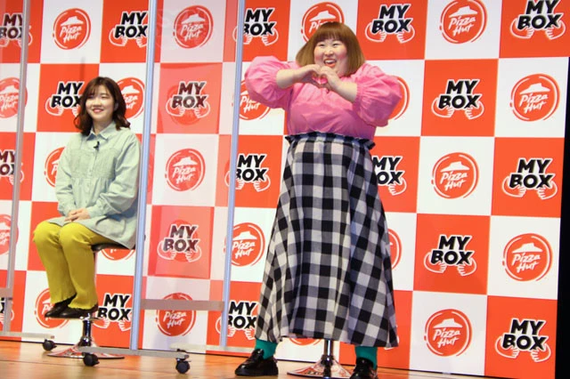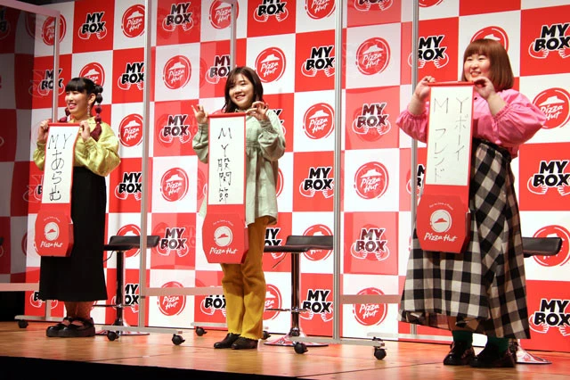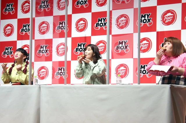 イベント中、あふれんばかりの笑顔でピザを試食した3人。おいしそうに食べていたものの、コメントは「全員! 下手くそ!」(福田)だったが、「ひとりでちょうどいいサイズ。私みたいにいっぱい食べたい人は5つくらい頼んでください」(かなで)と、"おひとり様向け"の『MY BOX』をPRした。