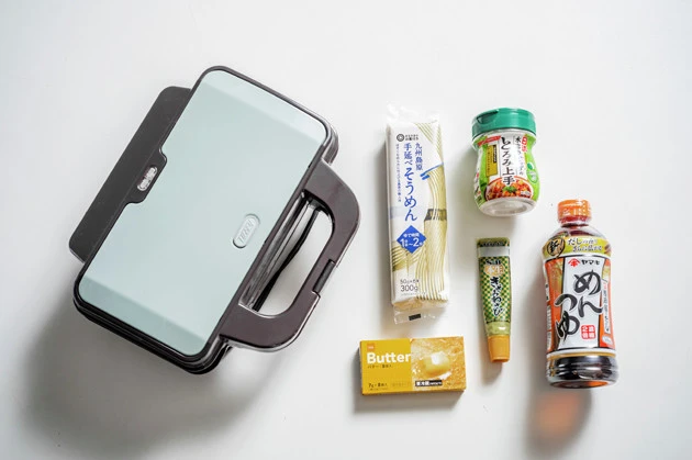 野島 で、ゆで上げたそうめんにバターを絡め、次に用意するのはホットサンドメーカー!