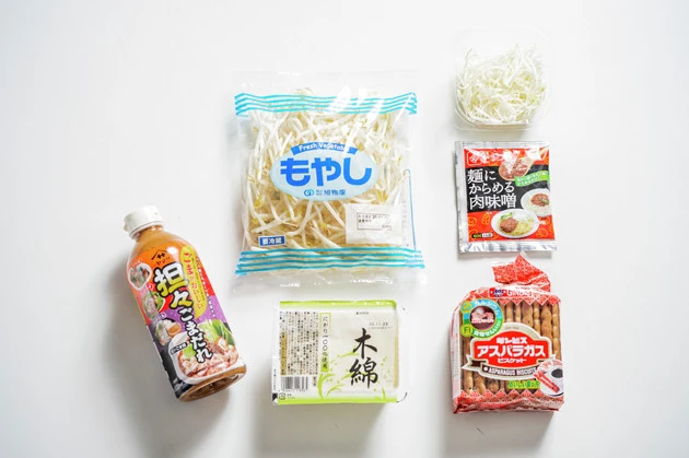 ・担々ごまだれ 適量 ・モヤシ 1袋 ・木綿豆腐 1パック ・アスパラガスビスケット 適量 ・肉味噌 適量 ・白髪ネギ 少々