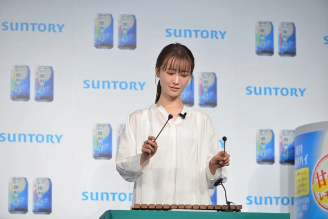 松本まりかが1日、都内で行なわれたサントリースピリッツの「『鏡月焼酎ハイ』に関する発表会」に出席。赤ら顔になった松本は「はじめてのチュウ」の木琴演奏を披露した。