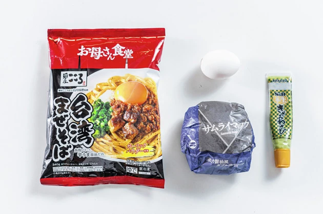 ・サムライマック 炙り醤油風ダブル肉厚ビーフ(マクドナルド) 1個 ・麺屋こころ監修台湾まぜそば(ファミリーマート) 1個 ・卵黄 1個 ・本生きざみわさび(S&B) 適量