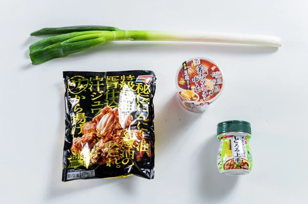 ・蒙古タンメン中本 辛旨豆腐スープ 1個 ・味の素 ザ☆から揚げ 1袋 ・ねぎ 適量 ・日清 水溶きいらずのとろみ上手 適量