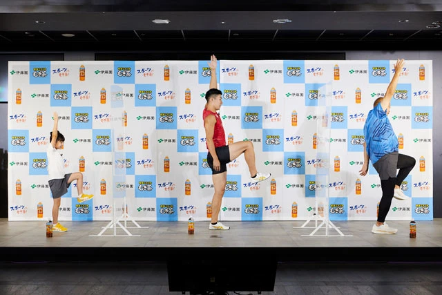 その後、イベントでは今回のキャンペーンで参加できる「鶴瓶さん&桐生選手の走り方教室」を紹介。WEBCMで共演する子役の諏訪結衣も参加し、実際にトレーニングの一部を行なうことに。