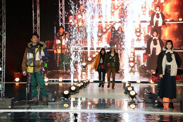 続いては、モデルらがランウェイへ。歩く先には、両脇から火花が吹き出し、花火の火花が当てられる演出も。防融加工したジャケットはまったく焦げ付くことなく、キレイなままだ。
