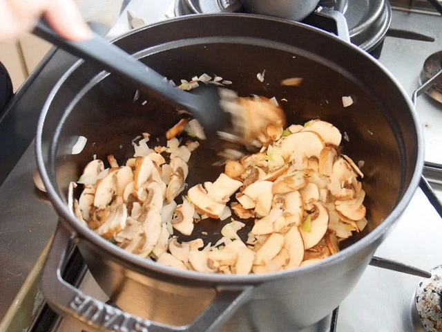 4.ニンニクやねぎの香りが立ってきたら、マッシュルームを加え軽く和える。