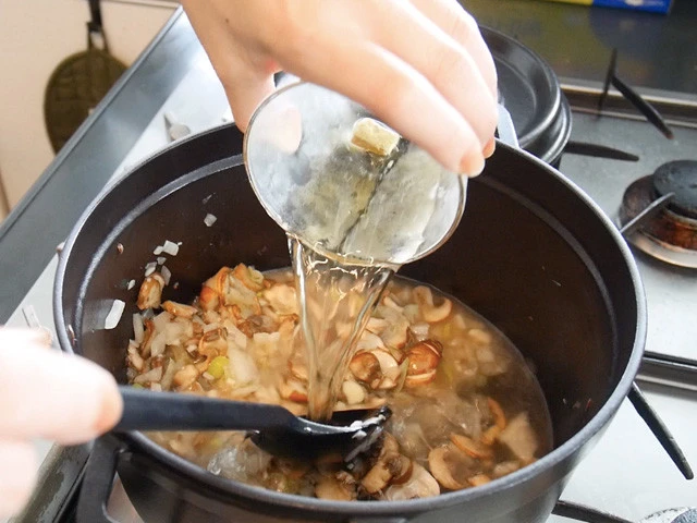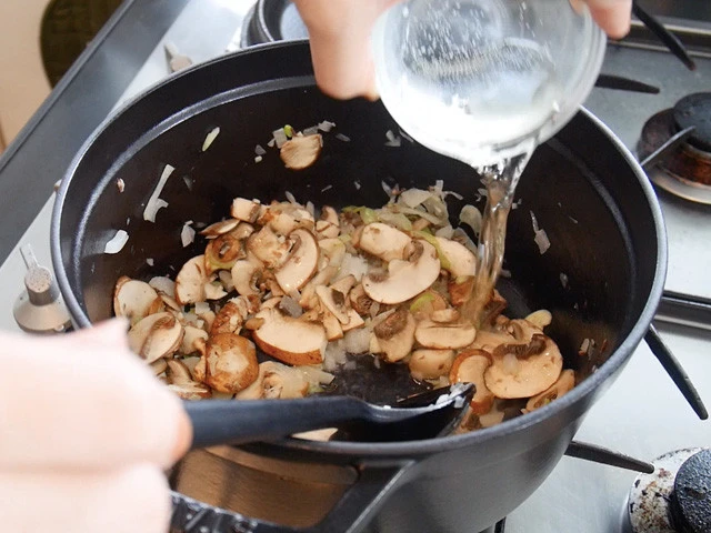 5.すぐに白ワインを入れアルコールを飛ばすようにして、きのこの旨味を引き出します。