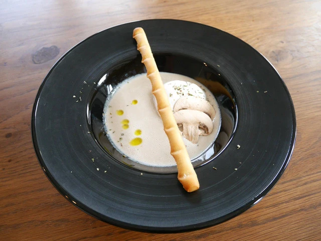 ミルクの泡を乗せてカプチーノ風に。マッシュルームの薄切りを飾るよ!