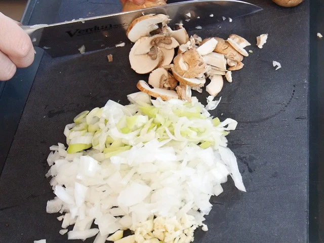 2.ニンニク、玉ねぎ、長ねぎをみじん切り(薄切りでも可)。マッシュルームは汚れをキッチンペーパーで拭いて薄切り。(トッピング用に2切れほど取っておく)