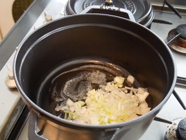 3.鍋にバターを入れ熱し、ニンニク、玉ねぎ、長ねぎを中弱火で香りが立つまで炒める。炒めすぎて色がつかないように!