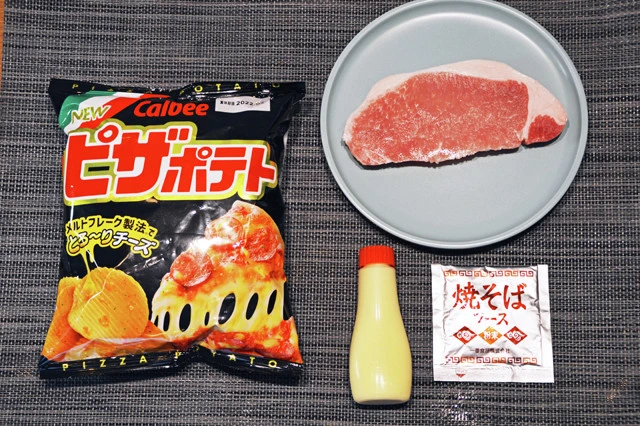 ・豚ロース(とんかつ用)1枚 ・ピザポテト 1/2袋 ・マヨネーズ 適量 ・粉末ソース 適量