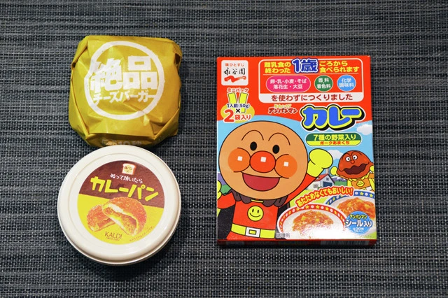 ・絶品チーズバーガー(ロッテリア) 1個 ・食パンにぬって焼いたらカレーパン(カルディコーヒーファーム)適量 ・アンパンマンミニパックカレー ポークあまくち 1個