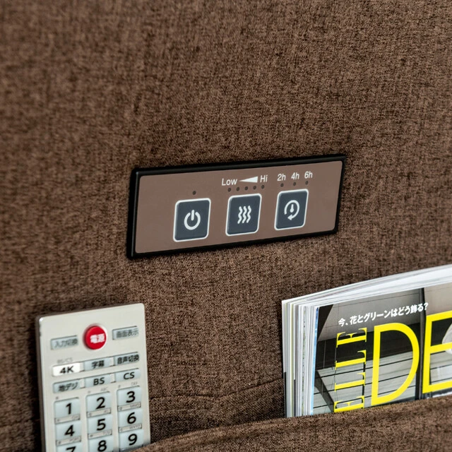 座面と腰部分にヒーター機能を内蔵したふたりがけソファ。温度調節やタイマーなどのコントローラーは肘置きのサイドに設置される。ヤマダデンキグループのECや実店舗で販売中。