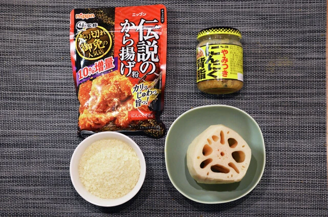野島 まだまだジャンクにしていきますよ。からしレンコンは衣をつけて揚げるんですが、今回は市販のから揚げ粉を使います。衣はザクザクに仕上がるし、味もいい感じに決まるんですよ。
