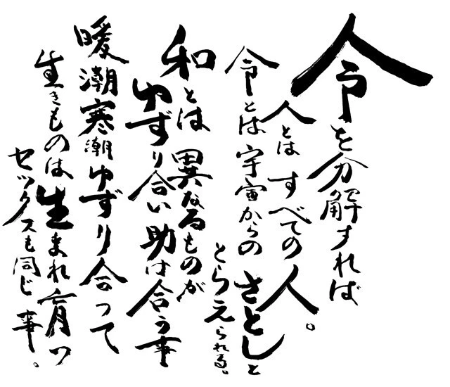 令和という書にどんな意味を込めるのか。(おもむろに筆を走らせ、上の文章を書き終えて)宇宙、神様や仏様は人間社会を見守っている。見守っているだけで指図はしない。人間は自由に動いている。