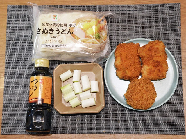 ・ファミチキ 2個 ・メンチカツ 1個 ・冷凍うどん 1人前 ・長ネギ 1/2本 ・めんつゆ 適量