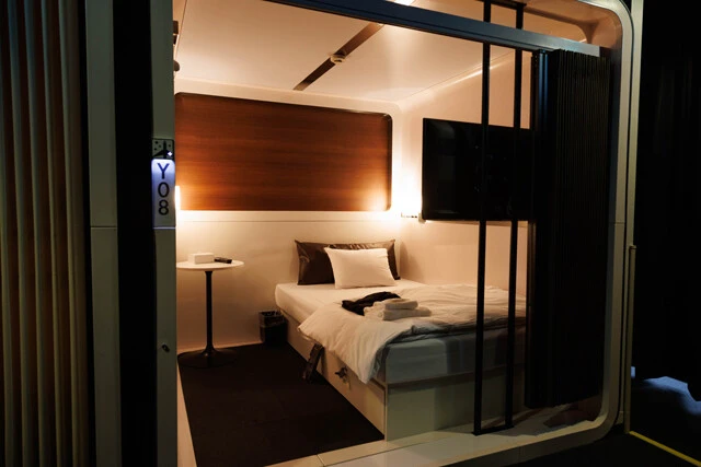 用意される部屋は4種類。写真は「ファーストクラスキャビン」(5000円・ファーストキャビン羽田T1の場合)となり、32インチのテレビ、無料Wi-Fiを完備。部屋の出入り口はアコーディオンカーテンで仕切られており、音楽や動画再生時の音漏れには要注意。ノイズキャンセリング機能を搭載するワイヤレスイヤホンがあると快適度アップですよ!