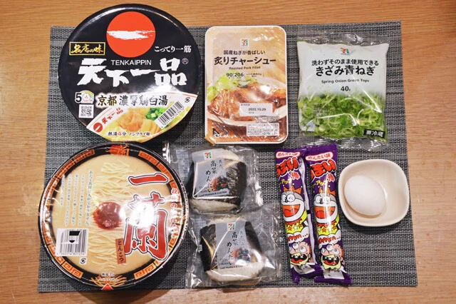 ・天下一品 京都濃厚鶏白湯 1個 ・一蘭 とんこつ 1個 ・炙りチャーシュー(セブンプレミアム) 1パック ・高菜めんたいこおにぎり 2個 ・青ネギ 適量 ・卵 1個 ・うまい棒めんたい味 2本 ※2人前の分量です。