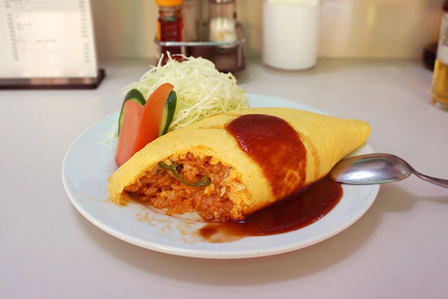 スプーンをすっと差し入れると、想像以上に柔らかな手応えとともに、カツンと皿に当たる。なるべく断面が美しくなるように掘削し(それがオムライスに対する礼儀な気がする)、ぱくり。表面にはハリがあり、中はふわりとろりと柔らかいオムレツが、穏やかな味のケチャップライスを包みこみ、口のなかで混ざり合う。このまろやかさが生クリームの賜物なのだろうか。ケチャップライスの具材は、ピーマン、玉ねぎ、マッシュルーム、そしてチキンではなくハムか。あ! もしかしてメニューのハムライスってこれのこと!?
