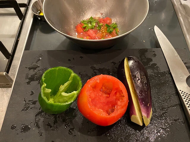 2.ピーマン、なす、トマトで器を作る(各2個)。ヘタを取り、ピーマンとトマトは中をくり抜き、なすは縦に切れ目を入れる(ヘタの周りやくり抜いた部分はボールに入れ次のタネと混ぜる)
