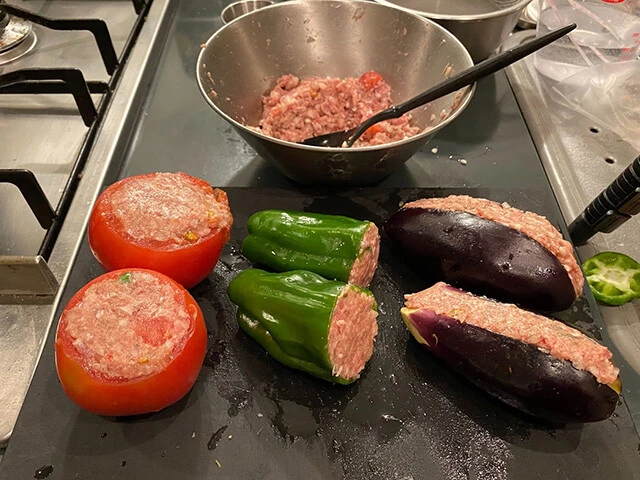 材料:ピーマン、なす、トマト(各2個)、挽肉、玉ねぎ、水、米、パセリ、塩胡椒、オリーブオイル、クミンパウダー、すりおろしにんにく、ローリエ、コンソメ