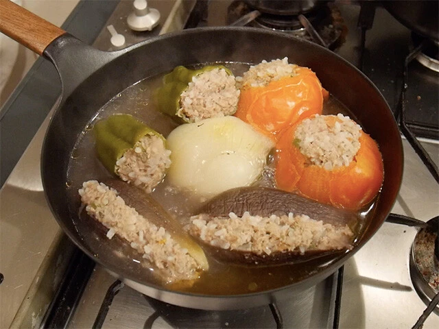 作り方は簡単でした。ピーマンに詰めるタネはハンバーグの具を作る要領で、あとは鍋で煮込むだけ。見た目は現地で食べたものとほぼ一緒でした。