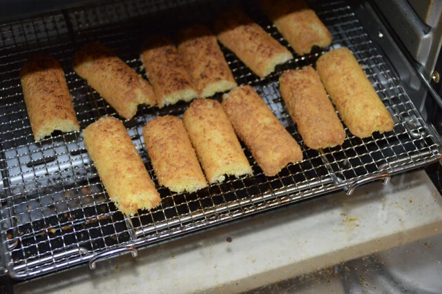 (12)うまい棒クルーラー ミスドのフレンチクルーラーを3個並べ、穴にうまい棒シュガーラスク味を挿入。ドーナツの穴はうまい棒を挿すためにあったのか!