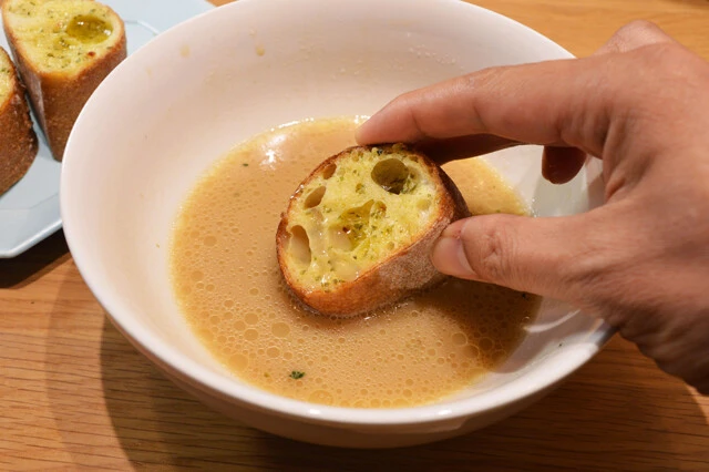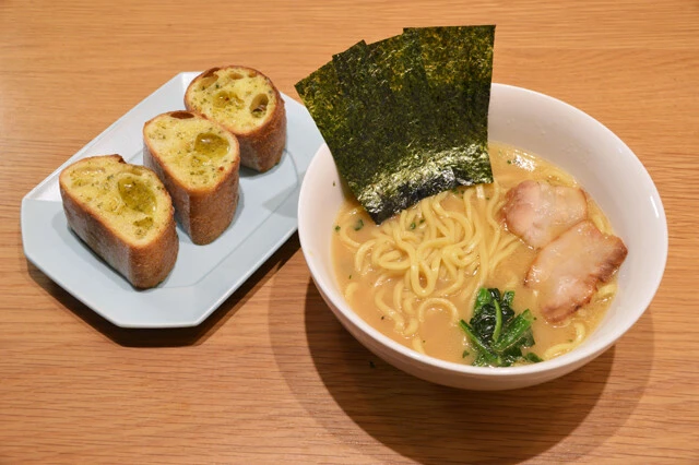 バゲットにガーリックマーガリンを塗って焼き、余ったスープに浸して食べる。本格家系スープをビタビタに吸収したガーリックトーストは絶品! パンでメシが食える!