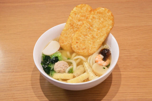 温めておいたハッシュドポテトを定番の「鍋焼うどん」にのせるだけ。たぬきうどんのように味がまろやかになるだけでなく、ほぐれたポテトが麺に絡み、食感の変化も楽しめる