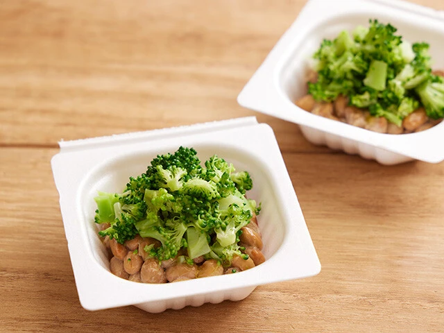 洗って小房に分け、ゆでて火を通した後、粗くみじん切りにしたブロッコリーを納豆にのせ、添付のたれとオリーブオイルをかければ完成