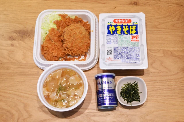・ロースメンチカツ弁当(かつや) 1個 ・とん汁 大(かつや) 1個 ・ペヤングソースやきそば 1個 ・こしょう 適量 ・刻みのり お好みで