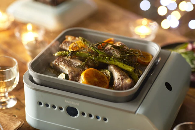 上下2枚のプレートを装備し、お好み焼きやステーキなど裏返すことなく、両面をこんがり焼き上げる。さらにプレートを全開すれば片面で調理、もう片面は保温と効率の良い調理が可能。