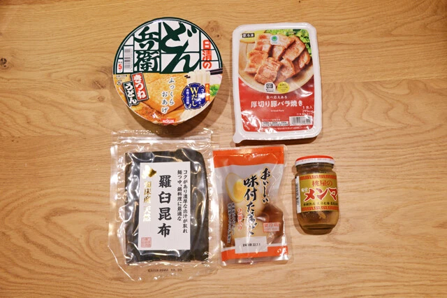 ・日清のどん兵衛 きつねうどん 1個 ・乾燥昆布(羅臼昆布) 10g ・食べ応えある厚切り豚バラ焼き(ファミマル) 1パック ・味玉 お好みで ・メンマ お好みで