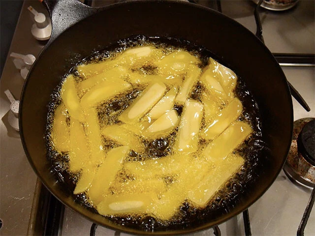5.2で残った油170℃にタラを入れ、両面キツネ色になるまで揚げたら「フィッシュ」のできあがり。
