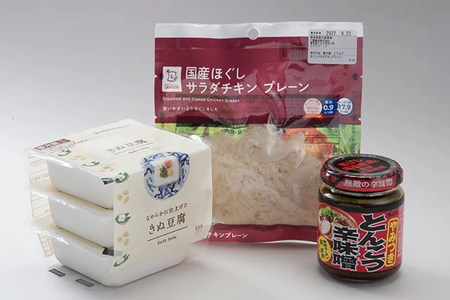 「ほぐしサラダチキンにとんこつ辛味噌をあえて、絹豆腐にのせる。お好みでゴマを振りかけてください」