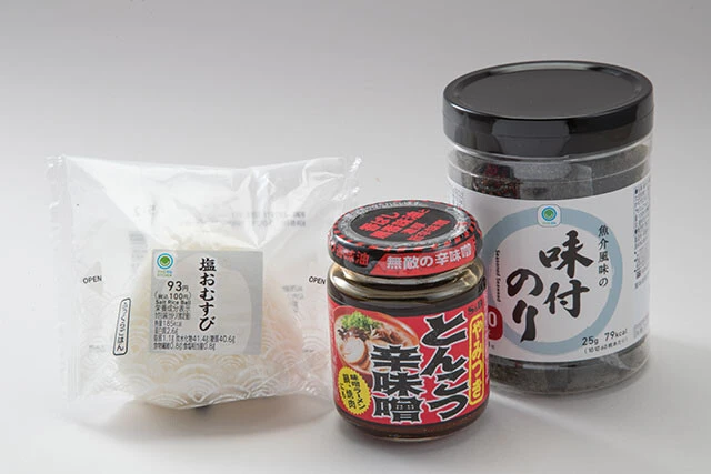 とんこつ辛味噌焼きおにぎり【塩おにぎり+海苔】①おにぎりの片面にとんこつ辛味噌を塗り広げ、その面を上にしてトースターで2分焼く②海苔で巻いたら完成