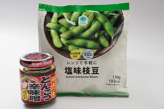 無限えだまめ【冷凍枝豆】①冷凍枝豆を袋の表示どおりレンジで加熱する②熱いうちに、皮ごととんこつ辛味噌を加えて混ぜ合わせる