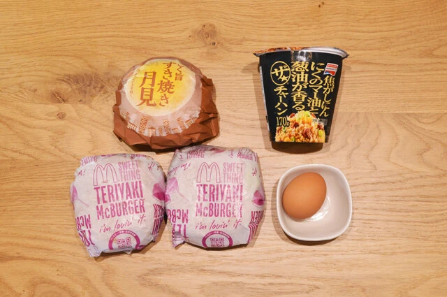 ・こく旨 すき焼き月見 1個 ・てりやきマックバーガー 2個 ・ザ★チャーハン(味の素冷凍食品) 1人前 ・卵黄 1個分