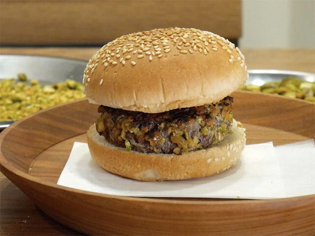 粗刻みのピスタチオに覆われた馬肉のハンバーガーパティ