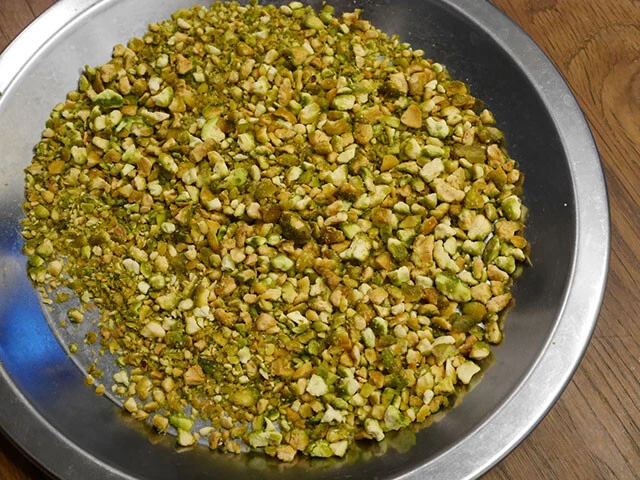 1.ピスタチオの殻を剥き、なるべく薄皮を取り除いたら、ジップロックに入れてめん棒などで潰し砕く。