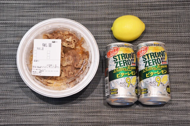 ・牛めし(松屋) 1個 ・-196℃ ストロングゼロ ビターレモン 350ミリリットル(サントリー) 2缶 ・レモン 1/2個 ※レモンは皮ごと食べられるものを使用
