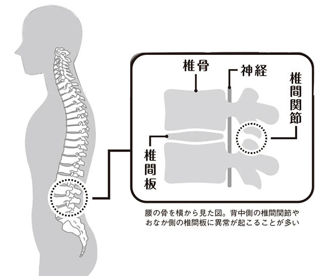 が挙げられます。腰を含む背骨は積み木のように重なって構成されていて、そのひとつひとつの骨が前方部分(おなか側)と後方部分(背中側)に分かれ、その間に神経が走っています。