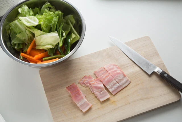 ①具材を切る。ニンジン、ピーマンは短冊切り。ベーコン、キャベツはひと口大に。