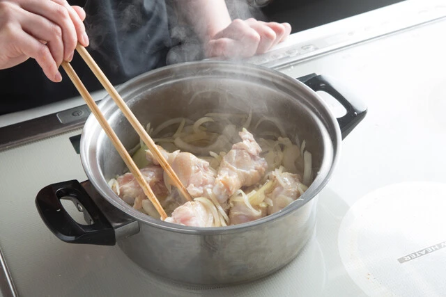 ②鍋にサラダ油を引いて、タマネギと手羽元にこんがりと焼き目がつくまでしっかり炒める。