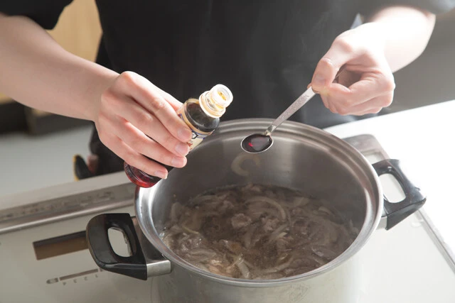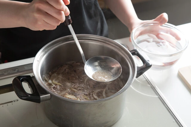 ②沸騰したら、牛肉とスライスしたタマネギをゆでる(15分くらい)。