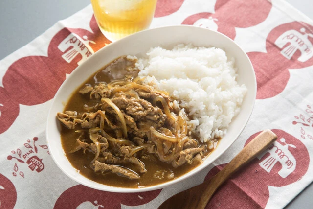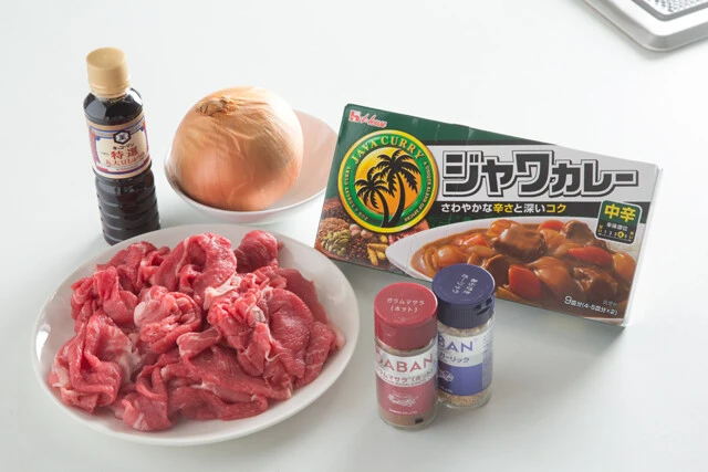 「ゴロゴロの具ではなく、あえて牛バラの薄切りを使うことで、汁だく牛丼のような食感が出ます。仕上げに使うGABANのガラムマサラは通常・マイルド・ホットがありますが、辛さだけじゃなく香りもそれぞれ違うんです。手に入るものでよいですが、個人的にはホットの風味がめちゃめちゃ好きで、これをかけるだけでどんなカレーも本格的な香りになります」