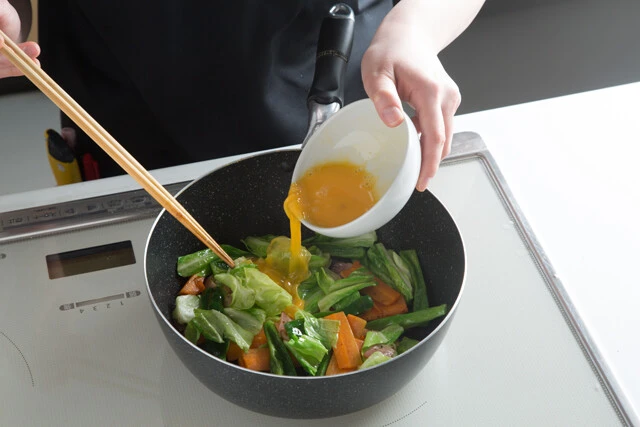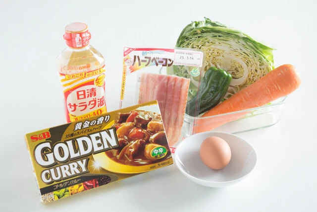 ③具材を炒める。フライパンにサラダ油を引き、ベーコン、ニンジン、ピーマン、キャベツの順に入れて炒める。最後に卵を溶いて流し入れ、半熟状態で全体に絡める。野菜はそこまで火を通しすぎないように気をつけること。