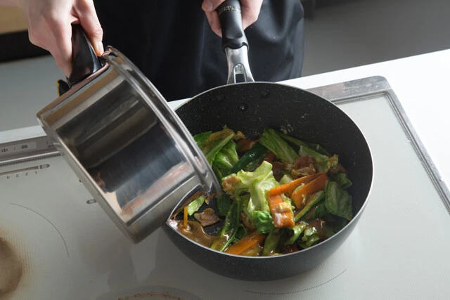 ④ルウを入れる。用意しておいた②のルウをフライパンの中に流し入れ、少し混ぜて加熱する。