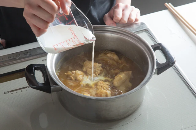 ⑤沸騰したら牛乳を加えて5分煮込んで完成。