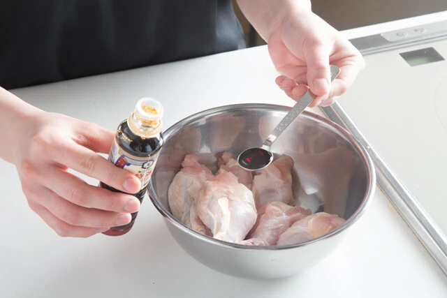 ①手羽元は骨に沿って切り込みを入れ、醤油で下味をつける。